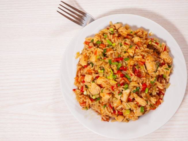 Leftover pork roast, onion, celery, cooked rice, soy sauce, and cream of mushroom soup are combined and baked until hot and bubbling.